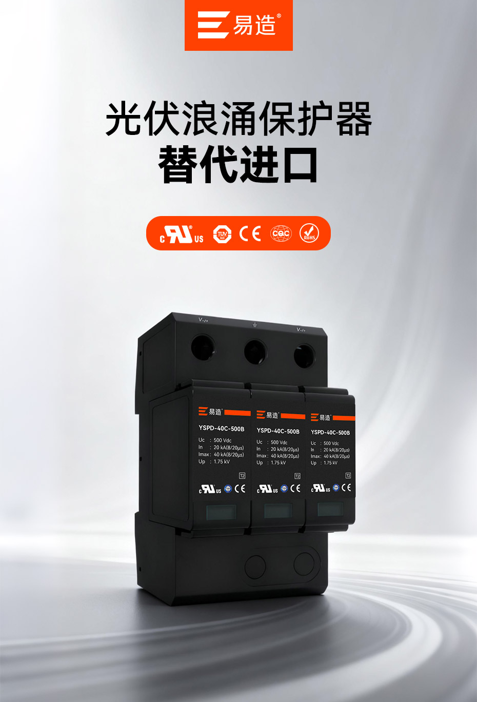 易造光伏浪涌保護(hù)器,直流電壓涵蓋100Vdc至1800Vdc,擁有UL、CSA、TUV、CE、CQC等國內(nèi)外質(zhì)量認(rèn)證,符合全球市場(chǎng)的最高質(zhì)量和歐盟環(huán)保標(biāo)準(zhǔn),穩(wěn)過驗(yàn)收,可替代進(jìn)口品牌SPD,支持出口。