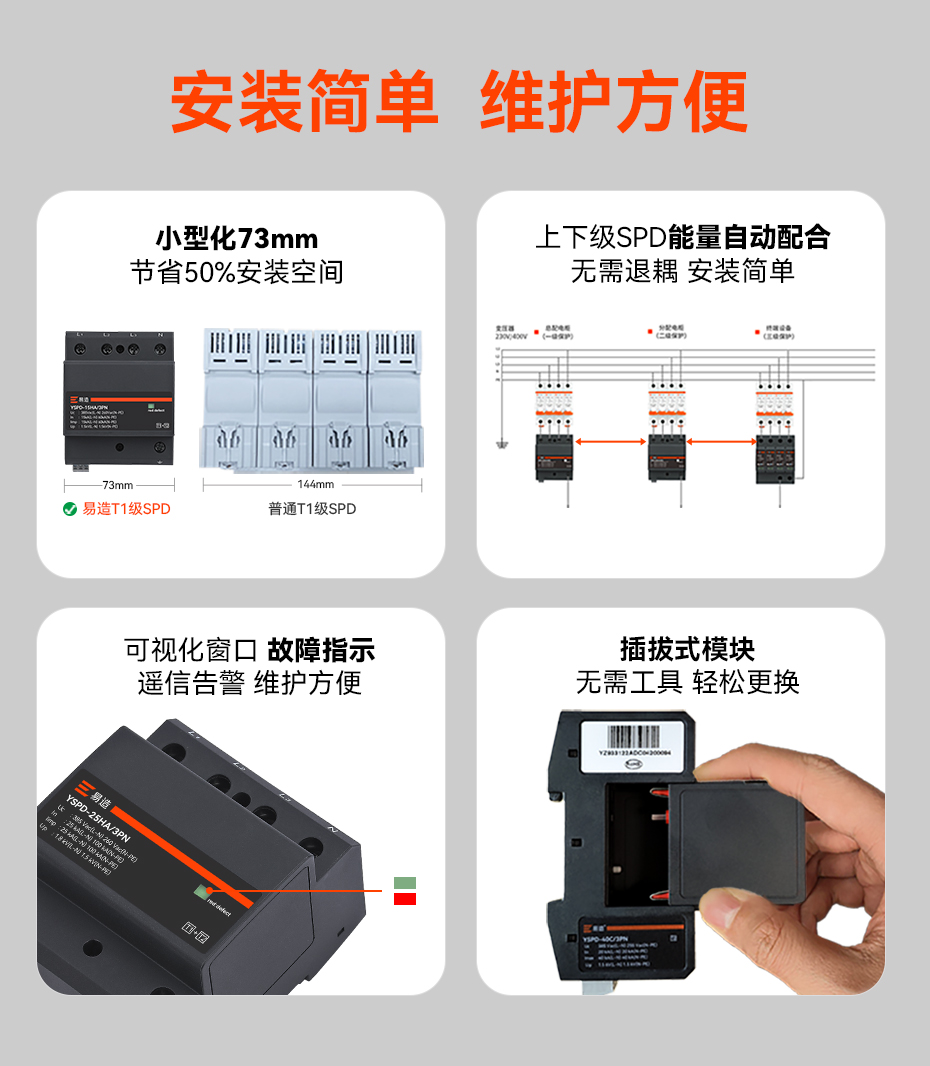 易造YSPD系列一級、二級、三級電源防雷器將安全和創新出色地融合在一起,采用突破性MG復合型技術,解決了傳統SPD的短板缺陷,無續流無漏電流,延長了SPD使用壽命并提高了供電效率;易造SPD小型化設計,每相寬度僅一個模數(18mm),使配電箱的空間更充裕,并具有本地及遠程告警功能,維護方便;靈活的鏈式放電技術簡化了SPD的安裝方式,上下級SPD能量自動配合,無需退耦器,顯著提升了電涌保護效率和TOV耐受能力,確保供電系統的穩定性。